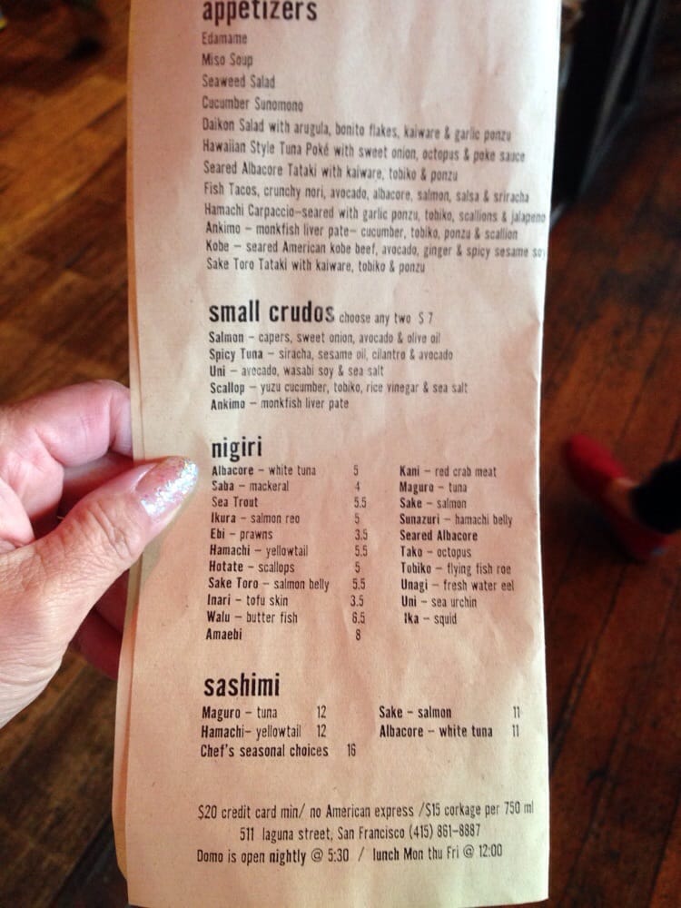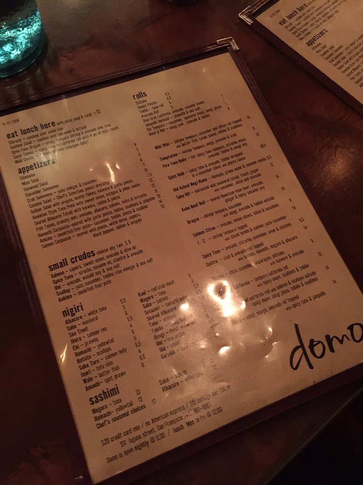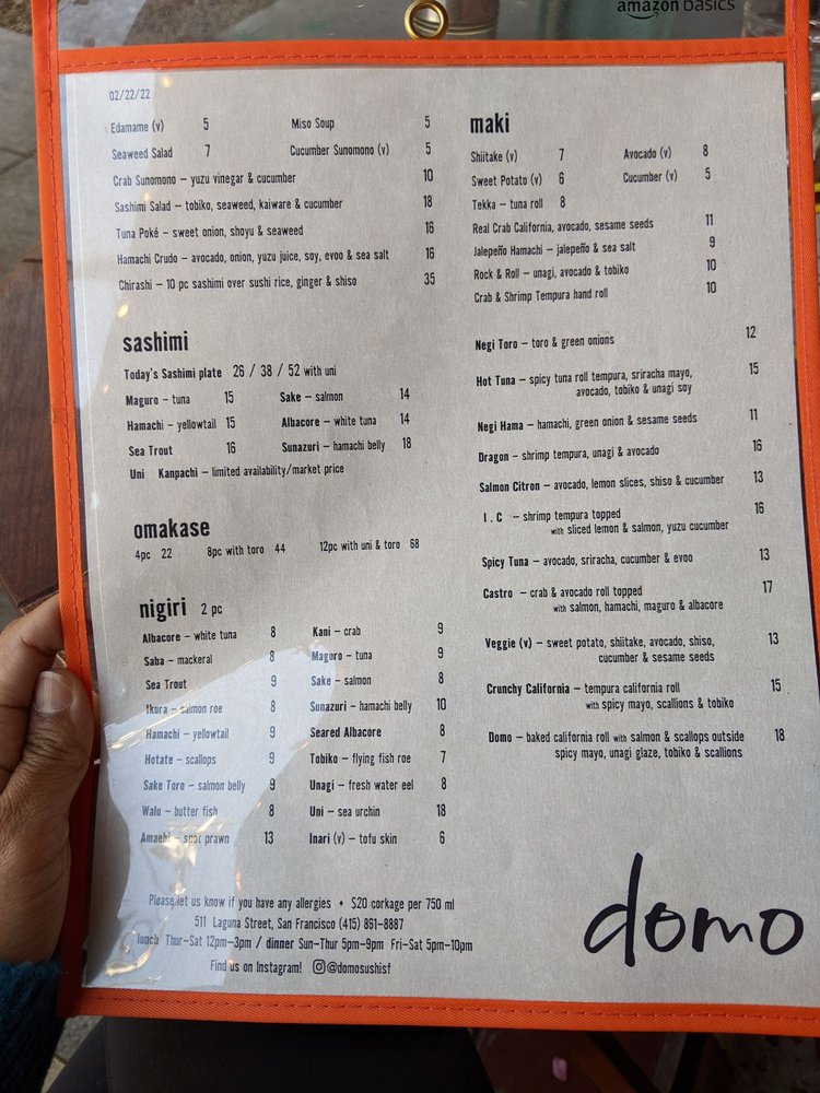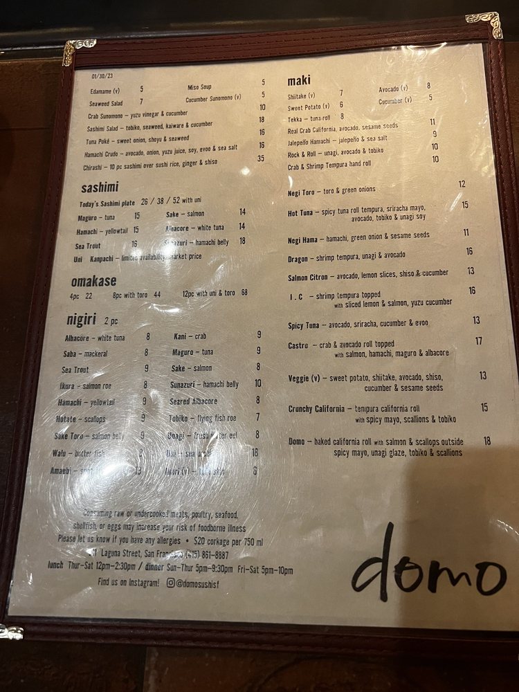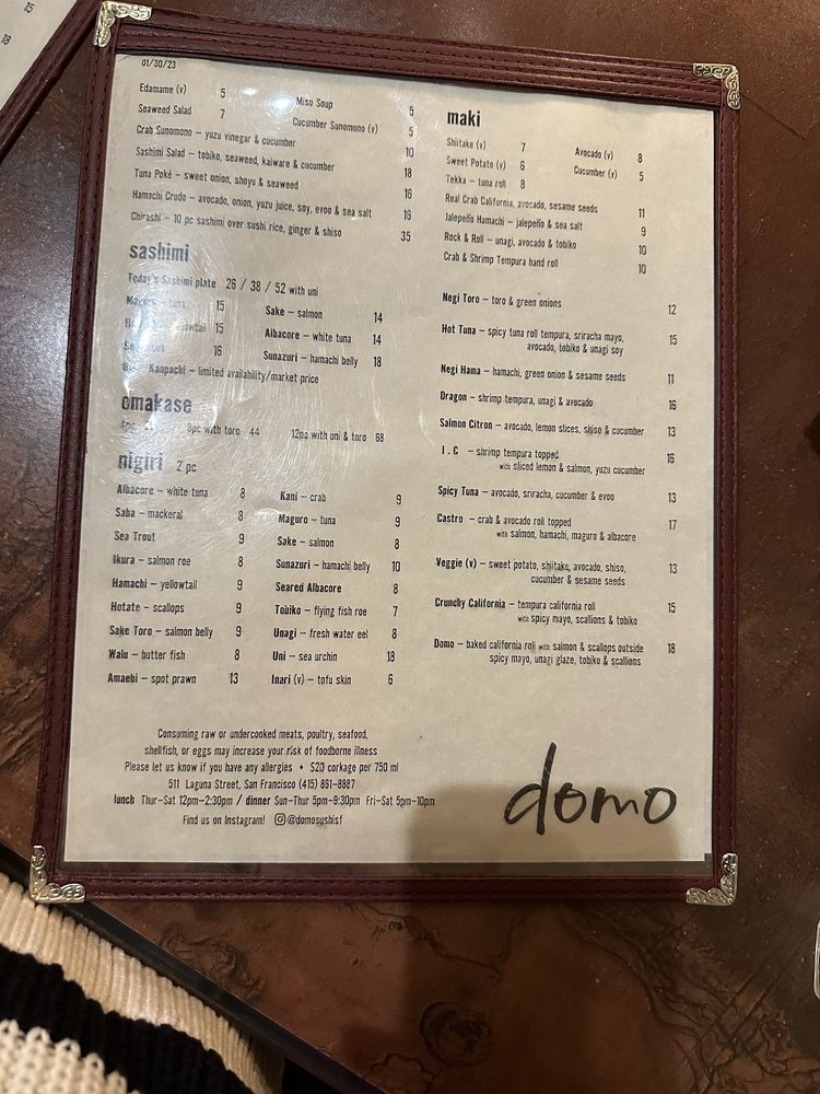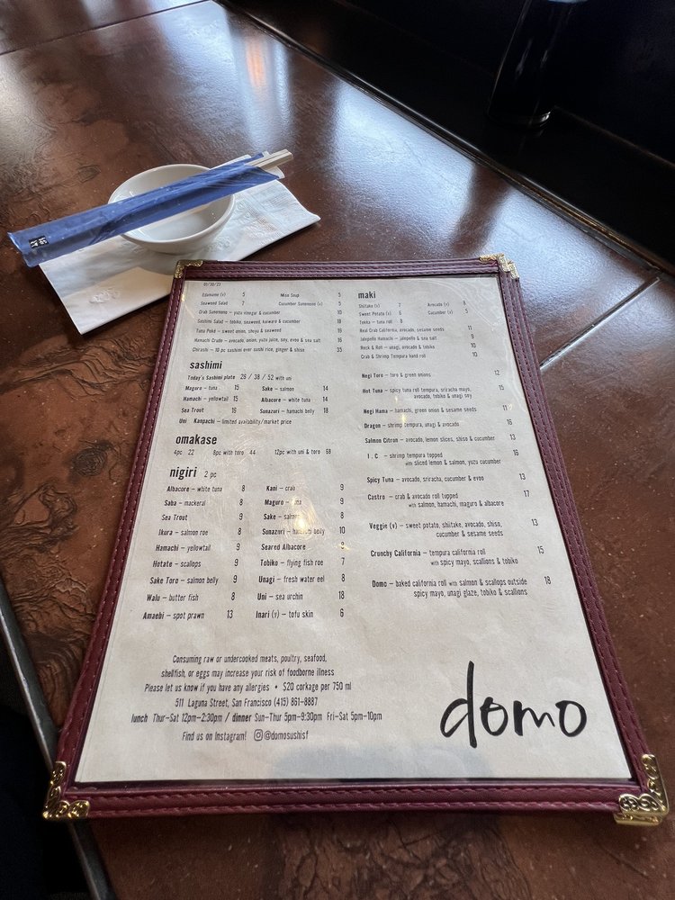 Introducing the menu at Domo, a cozy sushi spot in Hayes Valley, San Francisco. Offering a variety of fresh and delicious dishes, Domo is known for its Chirashi Special, hamachi crudo, and a selection of appetizers like edamame and fish tacos. Their nigiri selection includes options like albacore, salmon, and tobiko. Customers praise the fresh fish and reasonable prices, making it a great spot for a casual dinner or a date night. With limited seating both indoors and outdoors, reservations are recommended. Don't miss out on trying the Castro roll and Daddy Roll, along with their flavorful sashimi and rolls. Domo provides a warm and inviting ambiance, perfect for catching up with friends or enjoying a romantic evening out.