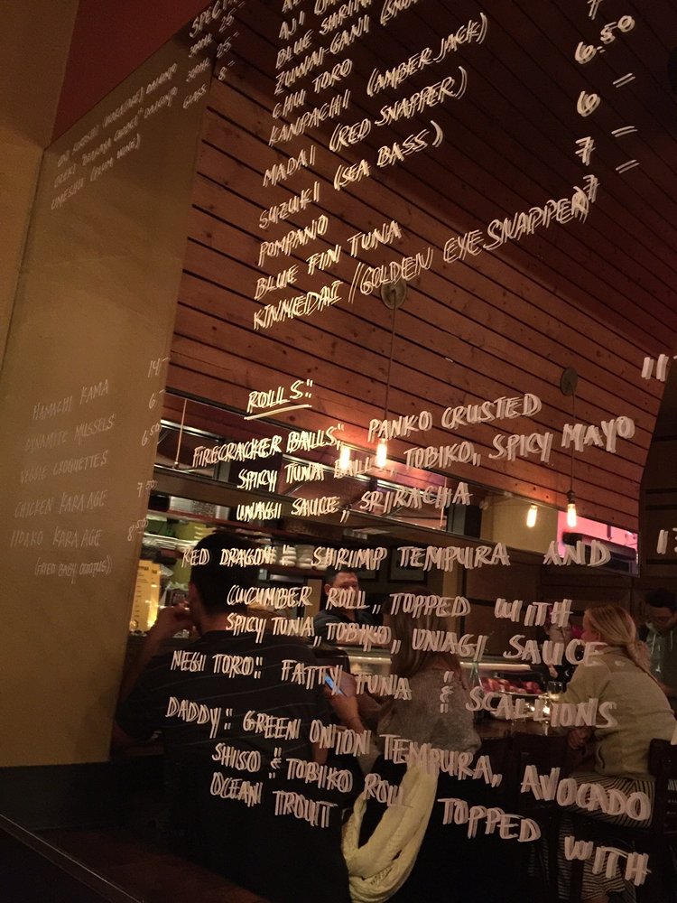 Green onion tempura, avocado, shiso and tobiko roll topped with ocean trout and yuzu sauce.